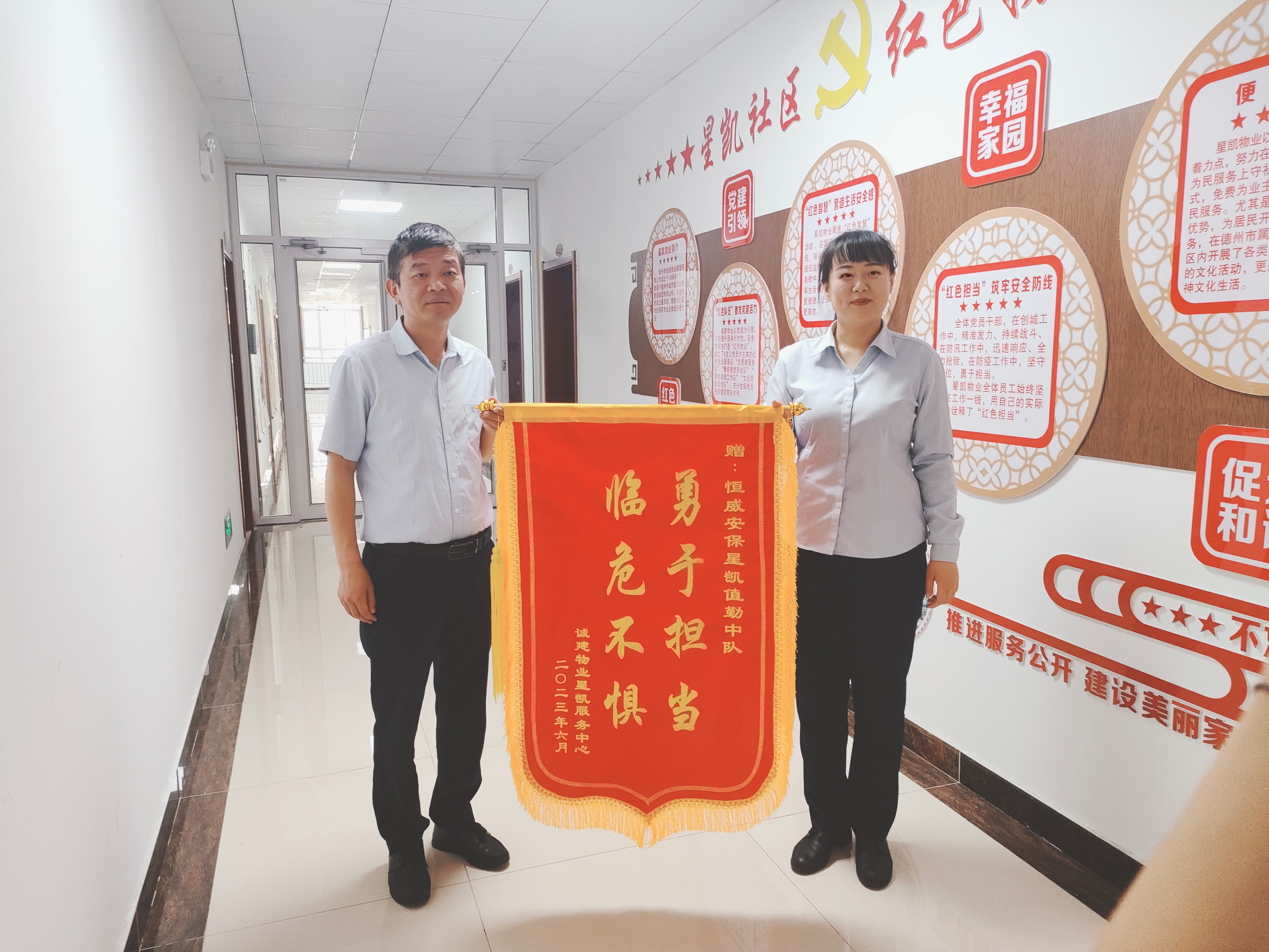 6月15日上午,星凯国际物业服务中心经理王海姝将一面写有“勇于担当,临危不惧”的锦旗交予e77乐彩四公司中队长宋兴斌的手中,对恒威安保驻星凯小区执勤班组,及时发现、正确处置、短时间内扑灭火灾,表示衷心地感谢。