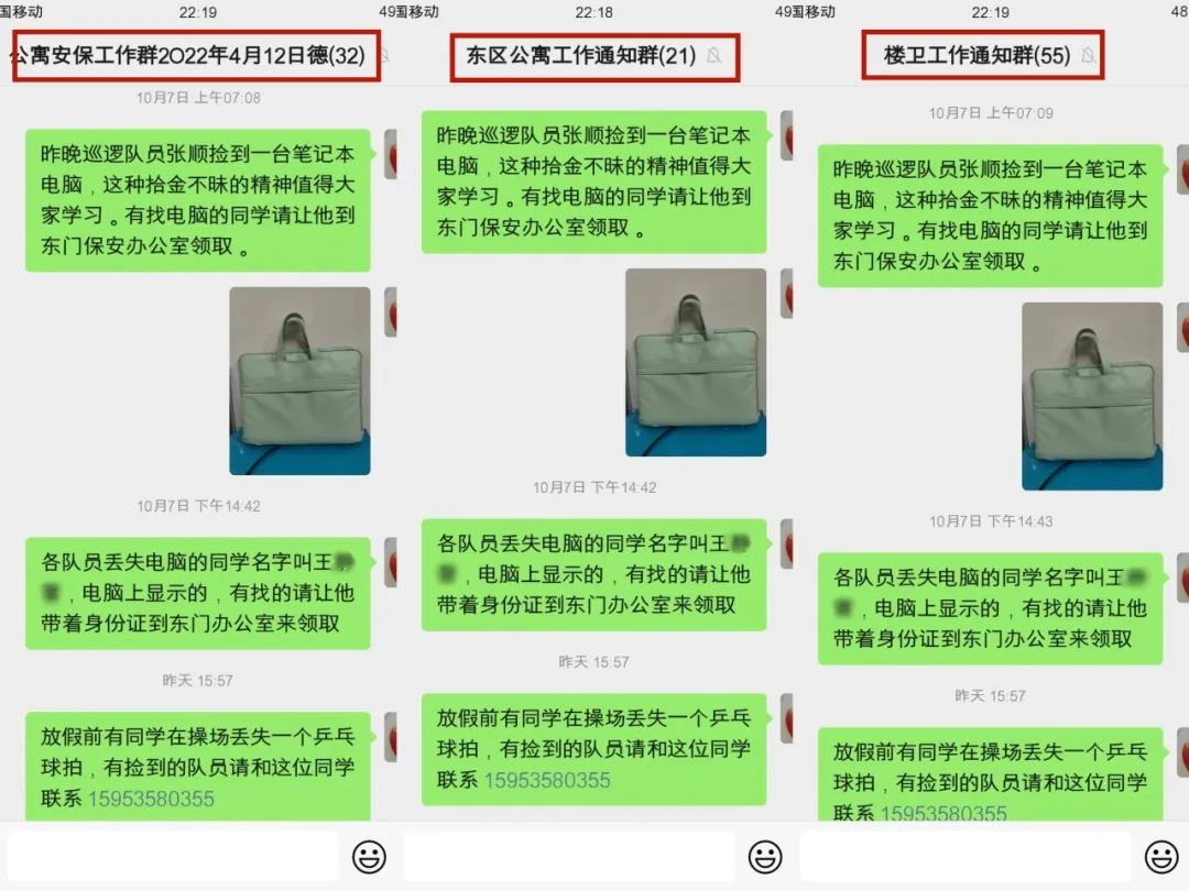 10月6日晚上,恒威安保驻德州学院班组保安员张顺在校园例行巡逻过程中,在路过14号公寓时,看到一辆共享单车车把上挂着一个蓝色办公包,里面装有笔记本电脑等物品,疑似被人遗忘在车上。张顺担心失主发现东西丢失后返回寻找,便在原地等待了半个小时,但失主迟迟未出现,张顺便将现场情况向队长刘明刚报告,并将电脑包移交校园警务室,同时在工作群中发布失物招领信息。