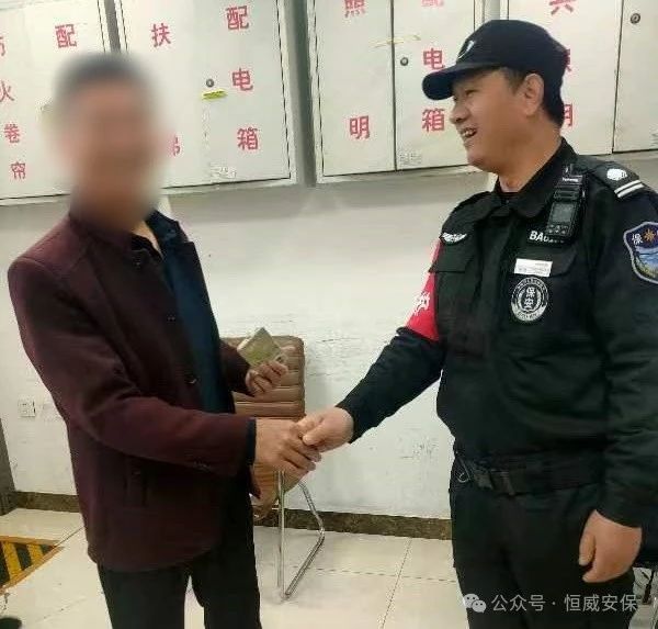 2024年4月15日上午9时许,正在山东大学齐鲁医院德州医院执勤巡逻的保安员祝少国,在医院门口的吸烟处发现一部手机,他立即告知在岗队员一起寻找失主,经调取监控,发现失主将手机遗忘在吸烟处,向医院外走了,由于手机设有密码,无法联系到失主,保安员祝少国便将手机放在值班室,等待失主来电,终于在9点半左右,失主打来电话,祝少国向失主说明情况,失主匆匆赶来。手机解锁后,祝少国将手机归还失主,失主随即掏出300元钱递给祝少国以示感谢。但被祝师傅直接拒绝并表示:“分内之事,这是我们应该做的。”失主对祝少国伸出大拇指,连声道谢,咱们保安员真棒!