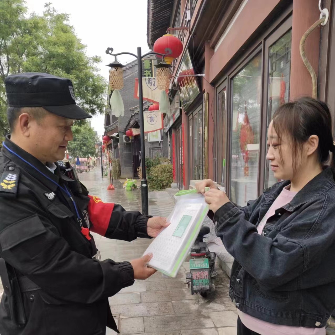执勤过程中,中队长乔连方捡拾学生用品一套,为了不耽误学生上课,经多方努力,终于联系到其家长,及时归还物品,家长连连道谢,并称赞:“最近古街的保安大哥的服务真的提升了很多,贴心了许多,更暖心了许多。”