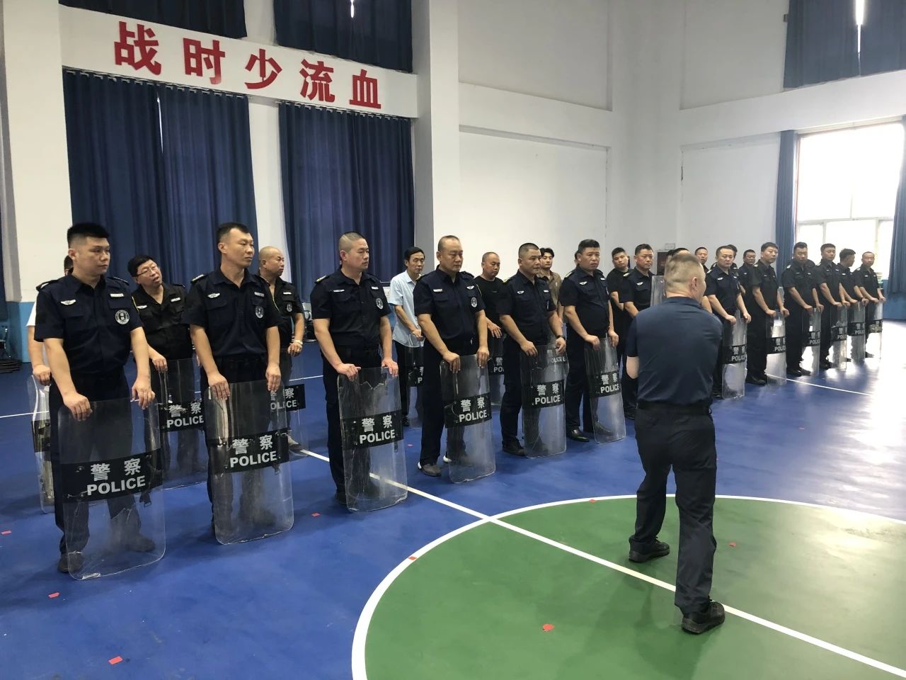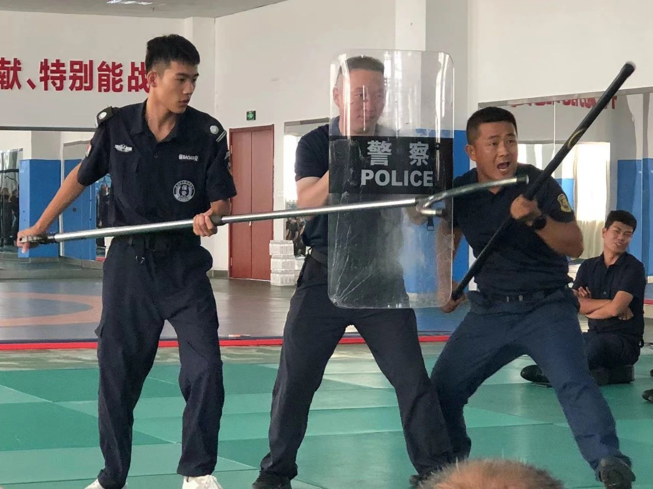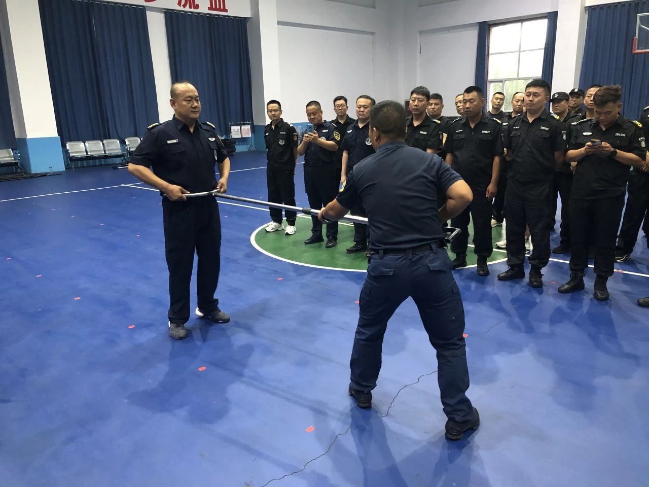 本次培训重点围绕突发事件应急处置展开,邀请德州市警察学校教官进行现场授课,详细讲解了长棍、盾牌、钢叉等防暴器材的使用要领和注意事项,演示了防暴器材在实战中的正确使用方法和技巧及最小作战现场处置专项训练,课程中对保安员徒手应急方位,现场紧急救护技术,警保联勤联动现场处置做了详细解说及演示。