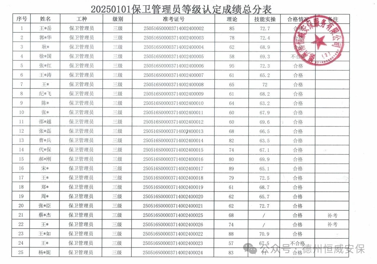 德州市第二批保卫管理员(三级)职业技能等级认定成绩公示: