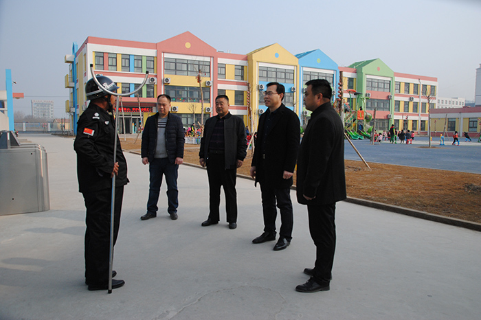 2月28日上午,e77乐彩庆云分公司总经理李建德、大队长李双陪同德州市庆云县教育局安全科孙科长、杨科长视察指导我公司承担的高校、中小幼校园安保工作。