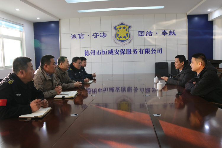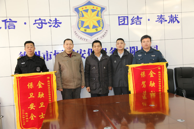 公司总经理王新卫在会议室热情接待了德州银行领导。介绍了公司近年来发展规模,人力防范、技术防范、物力防范三位一体的立体安防架构和主要安保工作经验。德州银行领导对我公司一年来提供的人防服务、夜间ATM机巡逻安保服务取得的成绩表示非常满意,特制作锦旗两面表示感谢。并强调今后会继续加强与我公司安保业务合作,同时希望我公司为德州银行安保工作做出更大贡献。