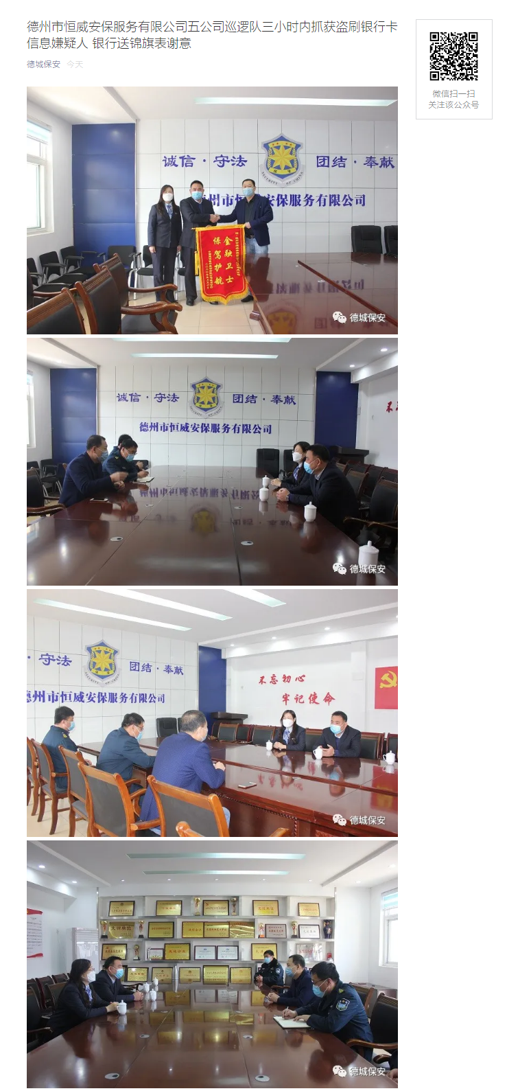 近日,恒威安保服务有限公司巡逻队在巡逻时发现一男子在某银行自助网点,安装了银行读卡器和摄相头,欲盗取银行卡信息进行违法盗取现金。恒威安保公司五公司接到通知,五公司领导高印东、尹纪昌好时间赶到现场,迅速组织精干队员,采取有力措施,仅三小时内便将涉嫌盗刷银行卡信息的犯罪嫌疑人抓获归案。目前犯罪嫌疑人已被派出所刑事拘留。 为表达谢意,4月3日上午,银行相关领导携带锦旗专程来到恒威安保公司,送上一幅书写着“金融卫士,保驾护航”的锦旗向抓获犯罪嫌疑人安保人员致敬。公司总经理王新卫接待了他们,并与他们交流了公司的安保情况,银行相关领导对公司的管理规范和安保人员的素质给予了较高的评价。